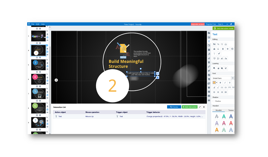 Adding interaction in presentation is another powerful way to capture attention. Selecting action object and mouse operation while choose a trigger object and its trigger behavior will make your content presented engagingly. The wonderful content delivery is significant to resonate classmates and teachers. They will speak highly of you with such a unique presentation experience.